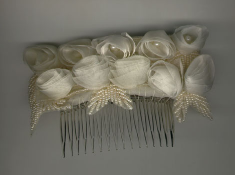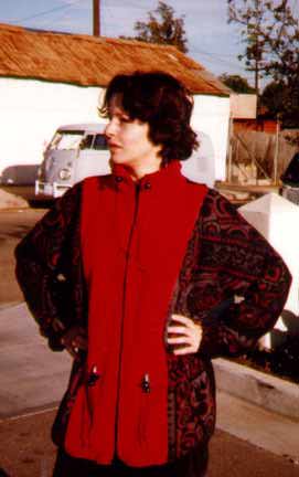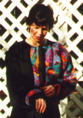 contrast. Polartec Colorblock Long Jacket (1991)Cherry red, black, and grey/red/black print polartec. Silk Baby Pants (1994)My Wedding Veil and Hairpiece (1992)I made a two-tier veil, from ivory illusion, and bound it all around with 1/16" ivory silk ribbon. It gathers it into the hairpiece which is set onto a comb. I made the hairpiece by forming milliner's wire into a rectangle, covering it with several layers of silk organza by wrapping and sewing, and then appliqueing onto it the world's most beautiful bridal trim. The trim is a row of organza flowers, each of which has a pearl in the center, interspersed with leaves encrusted with tiny pearls. I put two rows of the trim on the hairpiece and filled it out by placing additional leaves. Marimekko Dress from High School (1972)